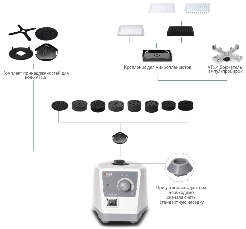 Вортекс с регулируемой скоростью вращения MX-S  Вортекс MX-S предназначен для перемешивания образцов в любых пробирках и других сосудах. К вортексу MX-S доступны различные адаптеры и насадки, позволяющие работать с различным количеством пробирок одновременно. Вортекс MX-S может применяться в медицине и фармацевтике для пробоподготовки, а также в других исследовательских лабораториях для перемешивания биологических субстанций и экстрагирования. Свойства вортекса MX-S: Диапазон скорости от 0 до 3000 об/мин для аккуратного встряхивания и быстрого перемешивания образцов. Режим работы: по нажатию или непрерывный. В комплекте стандартная насадка для перемешивания образца в пробирке или любом другом небольшом сосуде, диаметром не более 30 мм. Электронный регулятор скорости, поддерживающий постоянную скорость, даже при изменении нагрузки. Неподвижное основание со специально разработанными вакуумными «всасывающими» ножками, обеспечивающее устойчивость и гасящее вибрацию. Прочная конструкция из литого алюминия. Аксессуары, применяемые в вортексе MX-S:  | | VT1.1 платформа для перемешивания одной пробирки объемом до 50 мл. (в комплекте поставки) | |  | | VT1.2 держатель пробирок используется с VT1.3.1 - VT1.3.5, VT1.3.8-VT1.3.11 |  |  | | VT1.3 универсальная платформа Ø 100 мм. | |  | | VT1.3.1 адаптер для 48 пробирок диаметром 6 мм, (1 мл) используется с VT1.3, VT1.2 | |  | | VT1.3.2 адаптер для 15 пробирок диаметром 10 мм, (1,5-2 мл) используется с VT1.3, VT1.2 |  |  | | VT1.3.3 адаптер для 16 пробирок диаметром 12 мм, (5 мл) используется с VT1.3, VT1.2 | |  | | VT1.3.4 адаптер для 8 пробирок диаметром 16 мм, (10 мл) используется с VT1.3, VT1.2 | |  | | VT1.3.5 адаптер для 8 пробирок диаметром 20 мм, (10-15 мл) используется с VT1.3, VT1.2 | |  | | VT1.3.6 адаптер для пробирок и емкостей диаметром <99 мм используется с VT1.3 |  |  | | VT1.3.7 присоска вакуумная | |  | | VT1.3.8 адаптер для 24 пробирок диаметром 10 мм, (1,5-2 мл) используется с VT1.3, VT1.2 |  |  | | VT1.3.9 адаптер для 56 ПЦР тест-пробирок, 8 ПЦР стрипов диаметром 6 мм, (0,1 мл–0,5 мл) используется с VT1.3, VT1.2 | |  | | VT1.3.10 адаптер для 4 пробирок диаметром 28 мм, (0,1–0,5 мл) используется с VT1.3, VT1.2 | |  | | VT1.3.11 адаптер для 12 пробирок диаметром 9,8 мм, 12 пробирок диаметром 6,6 мм, 12 пробирок диаметром 5 мм, (1,5-2/0,5/0,2 мл) используется с VT1.3, VT1.2 | |  | | VT1.3.12 адаптер на большой платформе для 30 пробирок диаметром 9,8 мм, 55 пробирок диаметром 6,6 мм, 44 пробирок диаметром 5 мм, (1,5-2/0,5/0,2 мл) |  |  | | PS1.0 платформа для планшет |  |  | | VT1.4 держатель для 4 ампул или 4 пробирок от 0,2 до 15 мл. |  |  | | VT1.5 адаптер для колб от 100 до 250 мл. рекомендуемая скорость до 1500 об/мин. |  | Схема использования платформ и адаптеров вортекса MX-S:  Технические характеристики вортекса MX-S: | Диапазон регулирования скорости | | | | | 0-3000 об/мин | | Индикатор скорости | | | | | аналоговая шкала | | Тип движения | | | | | орбитальный | | Амплитуда | | | | | 4 мм | | Режим работы | | | | | по нажатию / непрерывный | | Макс. вес встряхиваемых образцов (с учетом веса аксессуаров) | | | | | 0,5 кг | | Габаритные размеры | | | | | 127х130х160 мм | | Вес | | | | | 2 кг | | Питание | | | | | 110-120, 220–230 В / 50 Гц | | Потребляемая мощность | | | | | 60 Вт | | Класс защиты | | | | | IP 20 | | Допустимая температура окружающей среды | | | | | 5-40 °C | | Допустимая относительная влажность | | | | | не более 80% | | Тип двигателя | | | | | с экранированными полюсами | | Номинальная входная мощность двигателя | | | | | 58 Вт | | Мощность двигателя | | | | | 10 Вт |